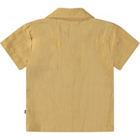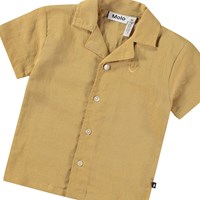Linnesskjorta för de små. Skjortan har korta ärmar, en fin krage och knappar med ljusa pärlknappar av modernt pärla, vilket gör den lätt att ta på. Skjortan är brun med en liten broderad smiley på bröstet.