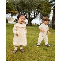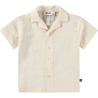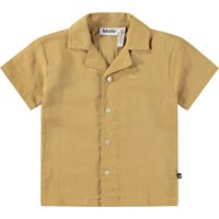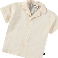 Linnéskjorta för de små. Skjortan har korta ärmar, en fin krage och knappfäste med ljusa pärlknappar, vilket gör den lätt att ta på. Skjortan är beige med en liten broderad smiley på bröstet.