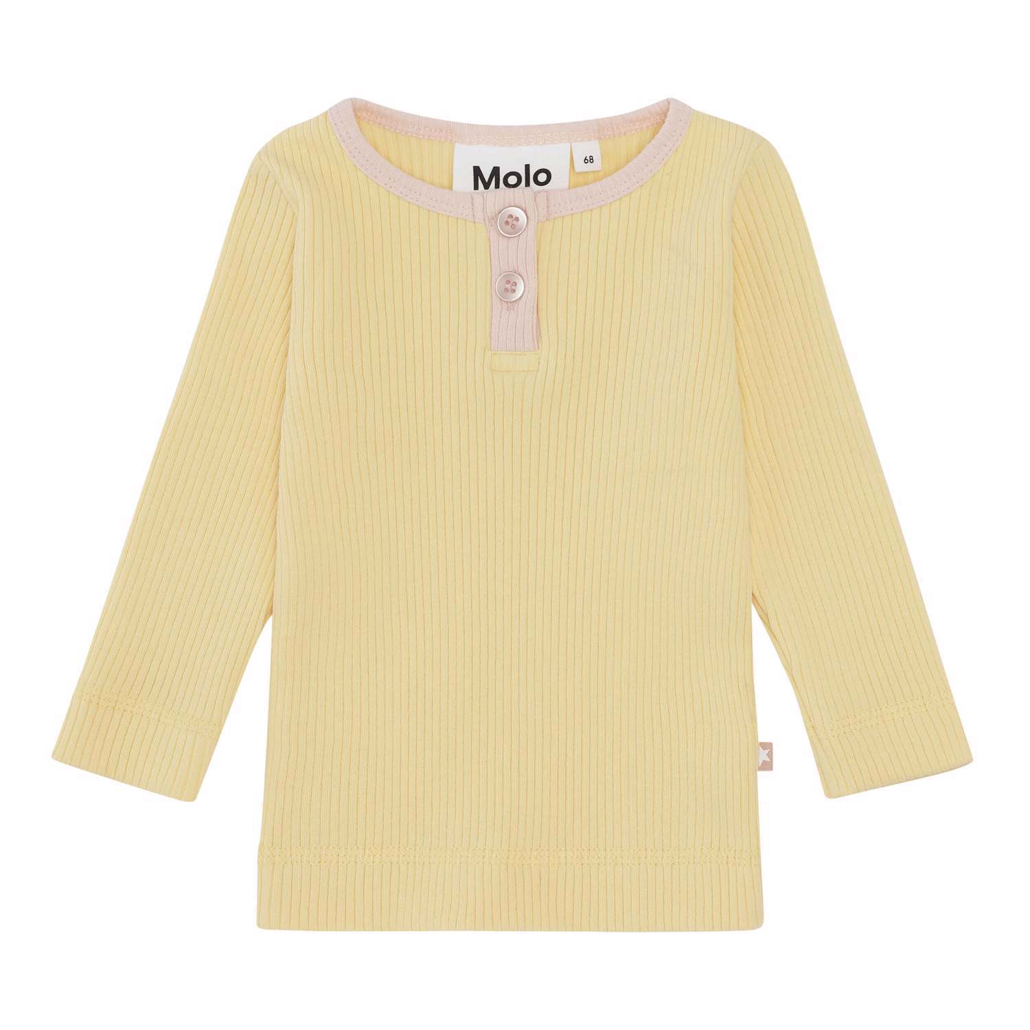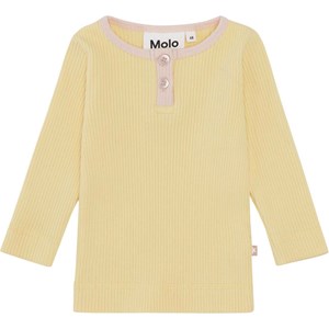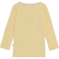 Earth är en ljusgul babytröja i ribbad kvalitet med knappar och rosa kant vid halsen. Kombinera tröjan med matchande byxor.