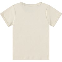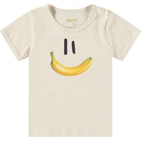 Beige t-shirt för de små i ekologisk bomull. T-shirten har en åtsittande passform, smala ribbade kanter på ärmarna och halsringningen, samt en knäppning på axeln som gör den lätt att ta på. T-shirten har en smiley med en bananmun.