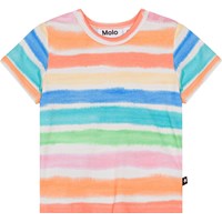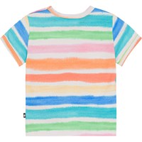 T-shirt till baby i ekologisk bomullsjersey. T-shirten har en tight passform, smala ribbkanter vid ärmar och hals samt två tryckknappar på vänster axel som gör den enkel att ta på. T-shirten har ett mönster med multifärgade ränder. Kombinera t-shirten med byxor i samma mönster och material för ett komplett set.