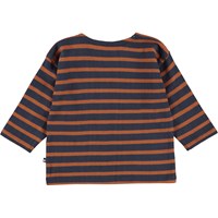 Edarko är en bretonrandig babytröja med långa ärmar och knappar på axeln. Tröjan har bruna och blå ränder.