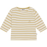 Edark är en bretonrandig babytröja med gyllene och vita ränder. Tröjan har långa ärmar och en liten smiley broderad på bröstet.