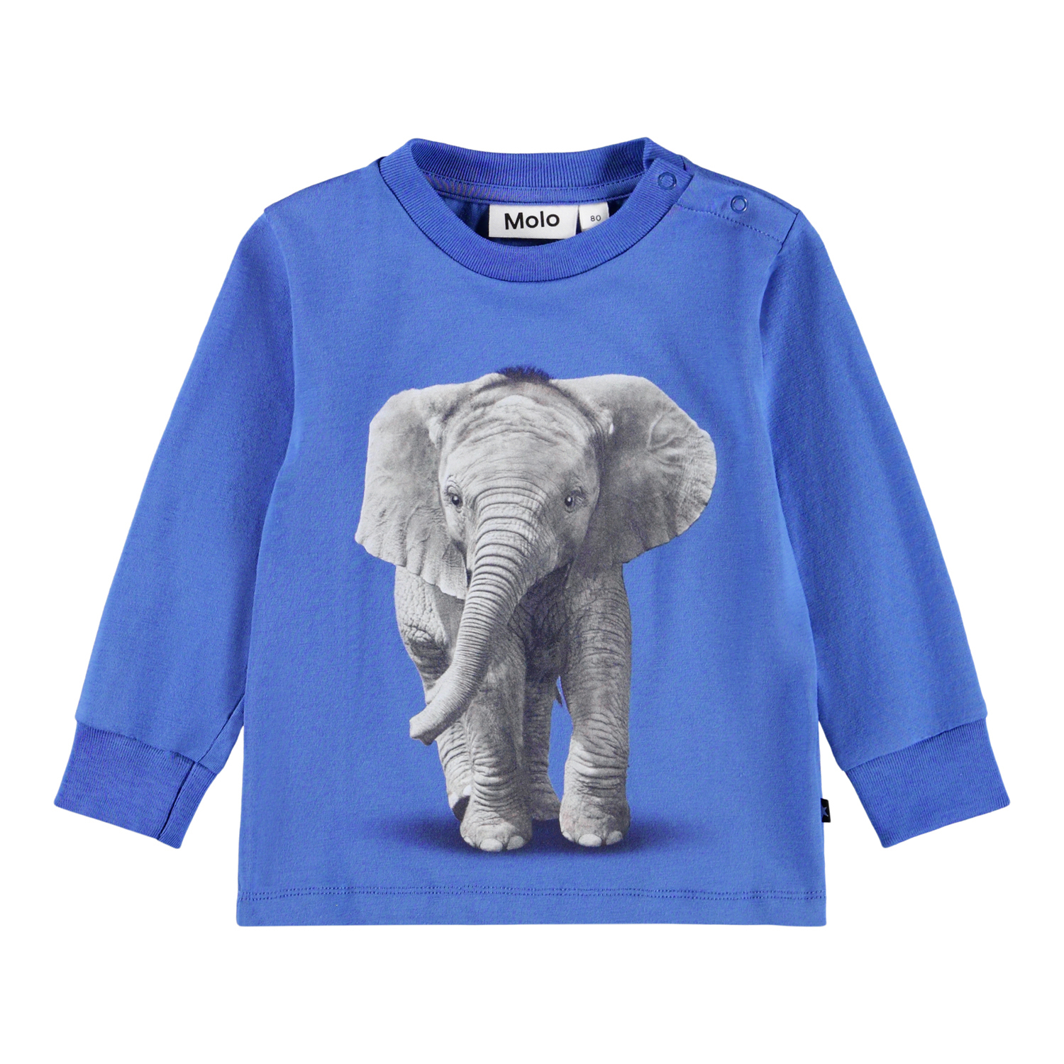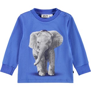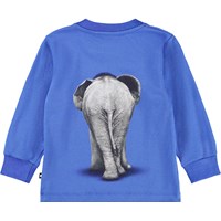 Blå långärmad topp för de små i ekologisk bomullsjersey med en babyelefant på. Toppen har långa ärmar, ribbade muddar och två tryckknappar på vänster axel för att göra den enkel att ta på sig.