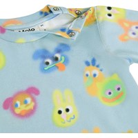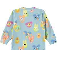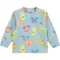 Blå, långärmad tröja för de små i ekologisk bomullsjersey. Tröjan har ribbade muddar vid ärmarna, ger bra rörlighet och har tryckknappar på axeln för att göra den enkel att ta på och av.
