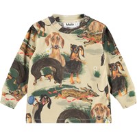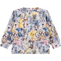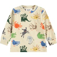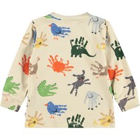 Beige långärmad topp för de små i ekologisk bomullsjersey. På toppen finns ett färgglatt handavtryck av olika djur. Toppen har ribbade muddar och två tryckknappar på vänster axel för att göra den lätt att ta på sig.