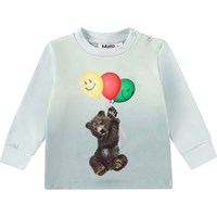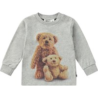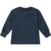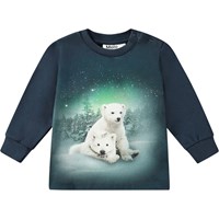 Mörkblå tröja i ekologisk bomullsjersey för de små med bra rörlighet och långa ärmar. Tröjan har ribbstickade muddar och två tryckknappar på vänster axel, vilket gör den lätt att ta på. På framsidan finns ett placerad tryck med två söta isbjörnsungar som tar en paus efter vild lek.