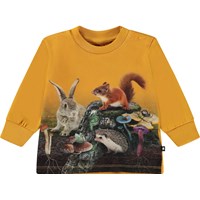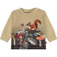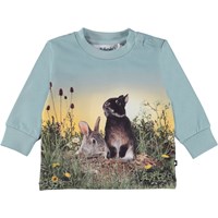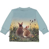 Blå tröja till de minsta. Här ses två små kaniner som just kommit upp från sitt kaninhål i en gräsäng med vilda blomor. På ryggen ser man kaninerna bakifrån. Denna tröja är tillverkad i 100% bomull, har långa ärmar och tryckknappar vid halsen vilket gör den enkel att ta av och på. Matcha ev. tröjan med byxorna, Sabb, i mönstret "rabbits".