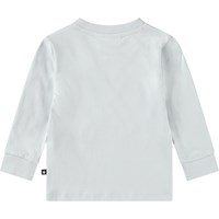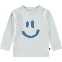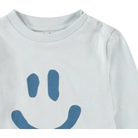 Långärmad topp i ekologisk bomullsjersey för de små. Toppen är designad för enkel rörelse, med långa ärmar, ribbade muddar och en knäppning med knapp på axeln för enkel påklädning. Den är ljusblå med en smiley.