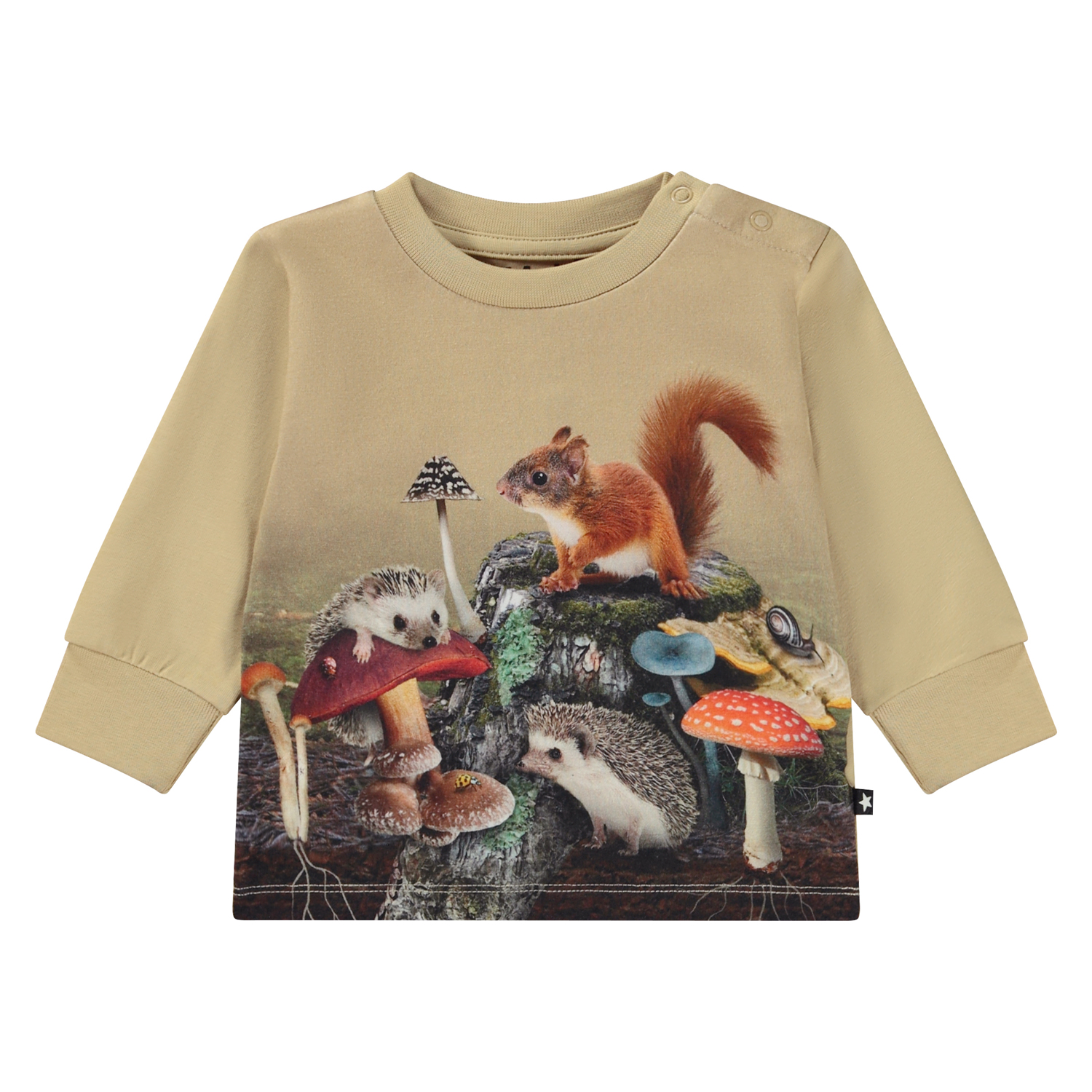 Beige tröja till de minsta. Här ses små gnagare och olika svampar från skogen. Man kan alltid hitta ett äventyr om man bara tittar noga. Denna tröja är tillverkad i 100% bomull, har långa ärmar och tryckknappar vid halsen vilket gör den enkel att ta av och på. Matcha ev. tröjan med byxorna, Sabb, i mönstret "Tree Root".