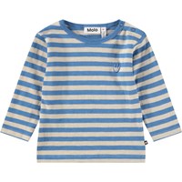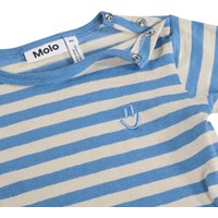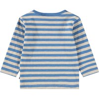 Långärmad skjorta för de små, med blå ränder i ekologisk bomull. Den ger bra rörlighet och har tryckknappar på axeln för att göra den lätt att ta på och av.