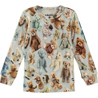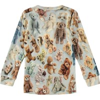 Multifärgad tröja i ekologisk merinoull för de små, med ett all-over tryck av teddybjörnar. Tröjan har långa ärmar med muddar och två tryckknappar på vänster axel, vilket gör den lätt att ta på.