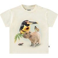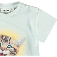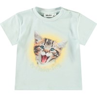 Klassisk t-shirt för de små i ekologisk bomull. T-shirten har en lös passform, rund halsringning med ribbad kant och knäppning på vänster axel, vilket gör den lätt att ta på. T-shirten är ljusblå med en glad kattunge.