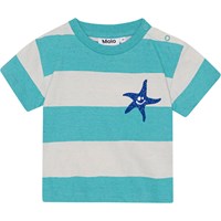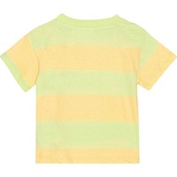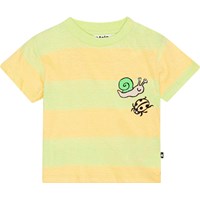 Klassisk t-shirt till baby i ekologisk bomull. T-shirten har en lös passform, rund hals med ribbkant och två tryckknappar på vänster axel som gör den enkel att ta på. T-shirten har breda ränder i ljusgul och ljusgröna färger och en söt nyckelpiga och en snigel framtill.