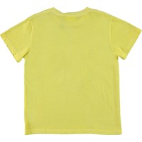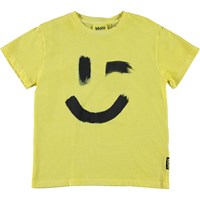 Rame är en ljusgul unisex-t-shirt med ett smiley-tryck på framsidan. T-shirten har en rund halsringning.
