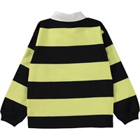 Svart och ljusgul, bredrandig, polotröja i ekologisk bomull. Tröjan har lånag ärmar med ribbkant, vit skjortkrage, logga framtill och en lös passform. Tröjan har tre dolda knappar vid halsen som gör den enkel att ta på och skön att ha på.