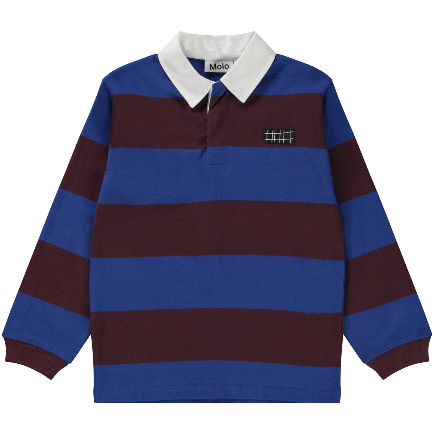 Blå- och vinrödrandig polotröja som är tillverkad i 100% bomull, har långa ärmar med ribbkant, vit skjortkrage, logo framtill och normal passform.