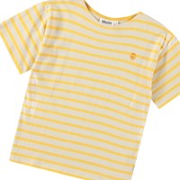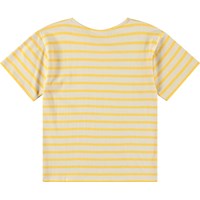 Beige och gul t-shirt i mjuk ekologisk bomull med korta ärmar och innerband i halsen. T-shirten har en lös passform med en liten broderad freds symbol på bröstet.