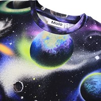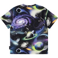 Svart T-shirt i mjuk ekologisk bomull med korta ärmar och en ribbad halsringning. T-shirten har en lös passform med rymden och planeter i många färger.