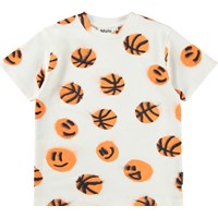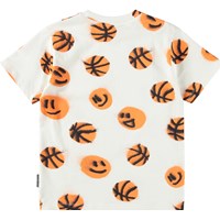 Beige T-shirt i mjuk ekologisk bomull med korta ärmar och ribbad halsringning. T-shirten har en lös passform med små basketbollar.