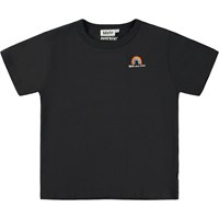 Här är en svart t-shirt med regnbågsbroderi på bröstet. T-shirten har korta ärmar och rund hals.