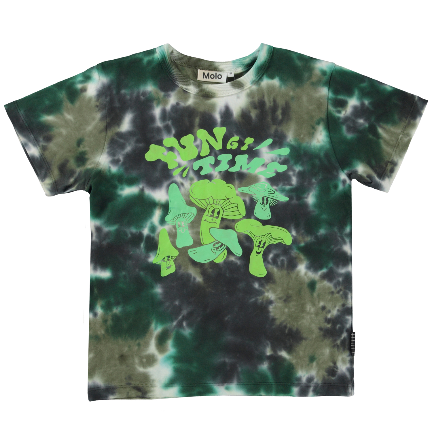 Grön t-shirt med tie-dye mönster i klargröna nyanser. Två glada svampar dansar och har det kul, de har en fest och är väldigt funky, eller ska man säga "Fungi"? Om du tittar noga kan du se att två svampar har dansat så galet att de hamnat bak i nacken på tröjan. Denna t-shirt är tillverkad i 100% ekologisk bomull, har korta ärmar, rund hals med ribbkant och en lös passform. Molo´s tie-dye är handgjort och kan därför variera från plagg till plagg.