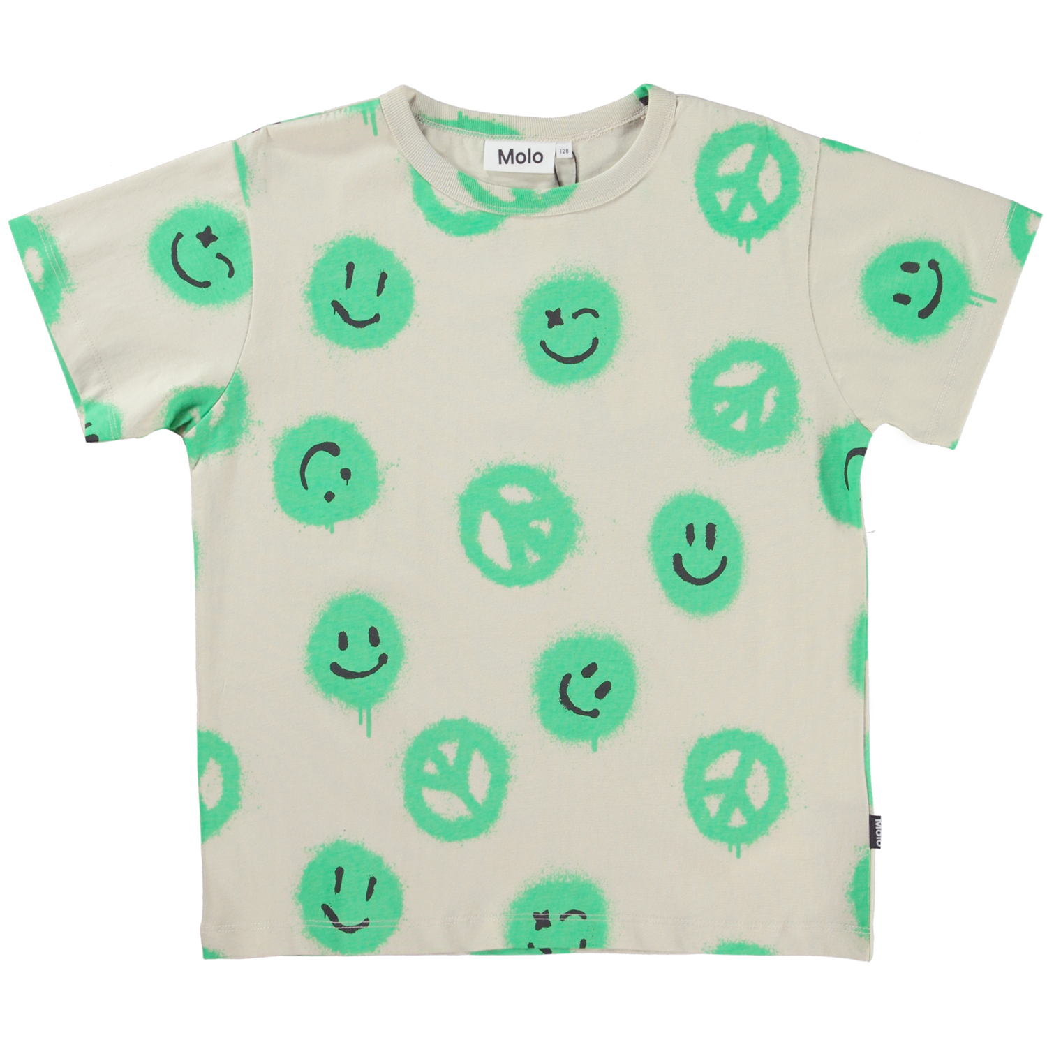 Riley är en oversized unisex t-shirt i beige med peacetecken och smileys. T-shirten har rund hals och korta ärmar.
