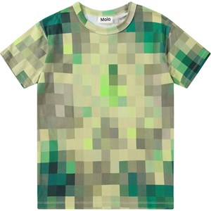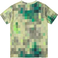 Grön ekologisk bomulls t-shirt med korta ärmar, rund hals och ribbad nederkant, samt löst passform med ett mönster av stora pixlar i olika nyanser av grönt.
