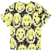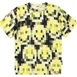 Gul och svart T-shirt tillverkad av ekologisk bomull. T-shirten har korta ärmar, en rund hals och ribbad nederkant. Den har en lös passform och ett mönster med leende ansikten över hela tyget, som bara syns som pixlar när man zoomar in.