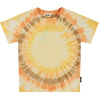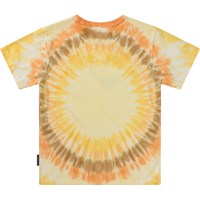 Gul t-shirt med tie-dye mönster i gula och orange toner, som stråler precis som solen. T-shirten har också budskapet "Shine On". Denna t-shirt är tillverkad i 100% ekologisk bomull, har korta ärmar, rund hals med ribbkant och en lös passform.