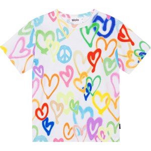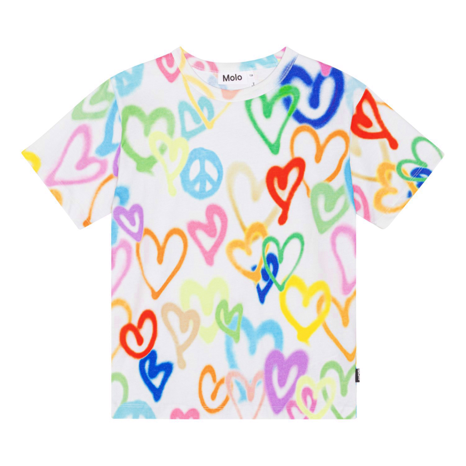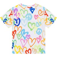 Vit kortärmad t-shirt i ekologisk bomull med hjärtan i olika färger. T-shirten har rund hals och normal passform.