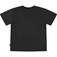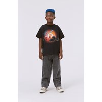 Svart t-shirt med ett rymdmönster med en retro känsla. Rymden är full av klara, vilda färger och fullt med kul. Här följer vi ett gammalt rymdskepp som jagar nya äventyr bland asteroidbälten. Här syns också en sol och budskapet "Shine on". Denna t-shirt är tillverkad i 100% ekologisk bomull, har korta ärmar, rund hals med ribbkant och en lös passform.