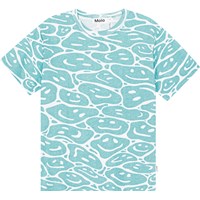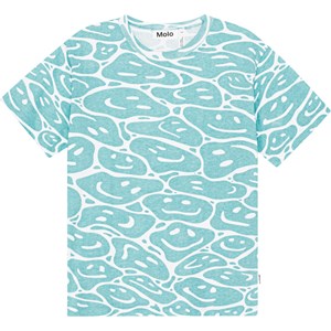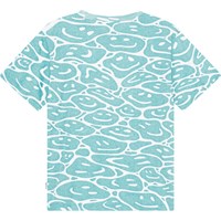 Ekologisk bomulls t-shirt med turkosblå och vita färger med smileys som smält samman. T-shirten har en rund hals med ribbkant och en normal passform.