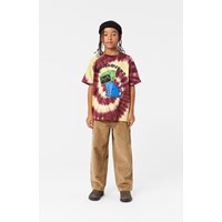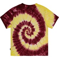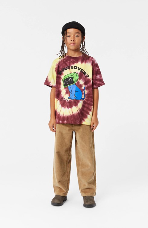 Gul och vinröd tie-dye T-shirt i ekologisk bomull. T-shirten har korta ärmar, en rund hals och ribbad kant vid halsen. Den har en lös passform och ett tryck på framsidan av en dator-katt som funderar på att leka med en dator-mus. Vår tie-dye är handgjord och skapar ett unikt mönster som varierar från stil till stil.