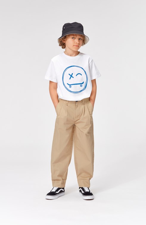 Roxo är en vit basic t-shirt med blå skatesmiley på magen.