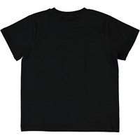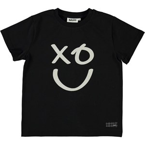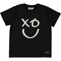Roxo är en svart t-shirt med en smiley på framsidan.