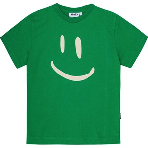 Molo x Plan International T-shirt i grönt, tillverkad av ekologisk bomull. T-shirten har korta ärmar och en rund hals med ribbstickad kant. Den har en normal passform och en stor beige smiley på framsidan. Läs mer om Molo X Plan International här.