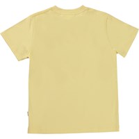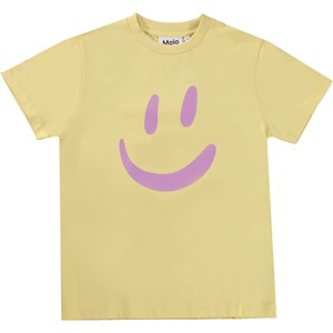 Gul t-shirt med stort leende framtill. Denna t-shirt är tillverkad i 100% ekologisk bomull, har korta ärmar, rund hals med ribbkant och en normal passform.