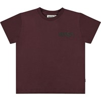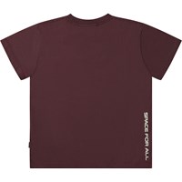 Vinröd t-shirt med svart NASA mönster. På sidan står det "Space for All" i vitt. Denna t-shirt är tillverkad i 100% ekologisk bomull, har korta ärmar, rund hals med ribbkant och en normal passform.