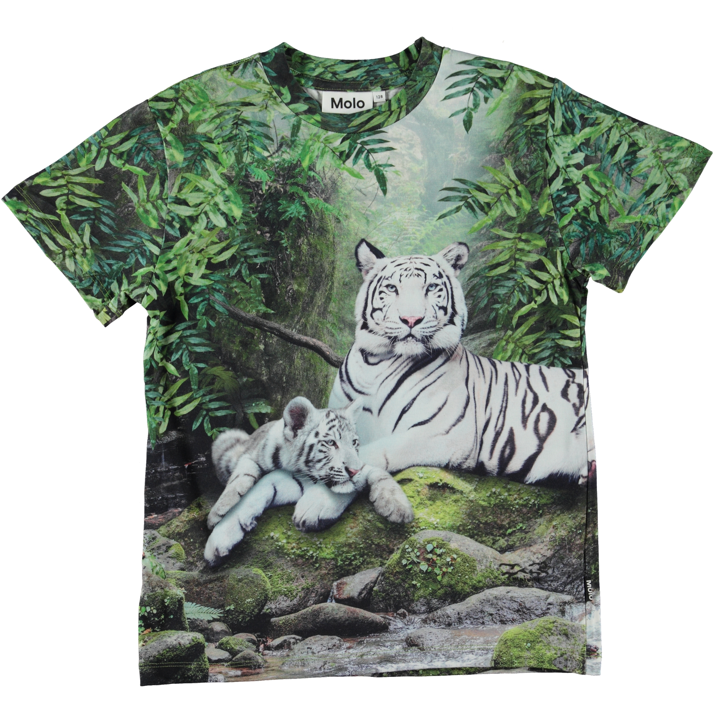 "Kortärmad t-shirt i ekologisk bomull med genomgående bild fram och bak. Bilden föreställer en tigermamma och hennes två ungar som kastar sig på de kalla stenarna nära ett porlande vattenfall i en frodig grön djungel. Nertill på t-shirten är en tryckt svart Panthera logga. Denna vara är en del är Molo´s kollektion i sammarbete med Panthera som är den enda organisationen i världen, som uteslutande är dedikerande till bevarandet av världens 40 vilda kattraser och deras ekosystem."