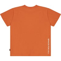 Orange t-shirt med vitt NASA mönster. På sidan står det "Space for All" i vitt. Denna t-shirt är tillverkad i 100% ekologisk bomull, har korta ärmar, rund hals med ribbkant och en normal passform.