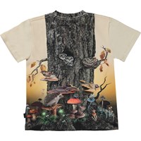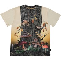 Multifärgadt-shirt med mönster både fram och bak. Här kan man vara ett med naturen och leva sig in i att vara både en växt eller ett djur. Trädstammen står tryggt och stadigt men skogens alla djur, växter och svampar som inneboende. Ärmarna är grenar som både kan omfamna världen eller sträcka sig upp mot himlen. Denna t-shirt är tillverkad i 100% ekologisk bomull, har korta ärmar, rund hals med ribbkant och en normal passform.