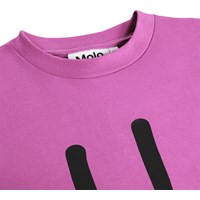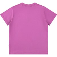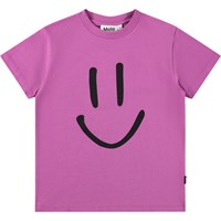 Lila T-shirt tillverkad i mjuk ekologisk bomull med korta ärmar och ribbad halsringning. T-shirten har en lös passform med en smiley.