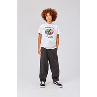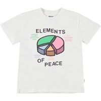 Roxo är en vit unisex t-shirt med texten "Elements of peace" och ett cirkeldiagram i flera färger, som visar vad som krävs för att uppnå fred. T-shirten har rund hals och korta ärmar.