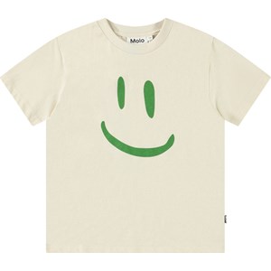 Off-white t-shirt i ekologisk bomull med korta ärmar och ribbad halsringning. T-shirten har en lös passform och ett stort grönt leende ansikte på framsidan.