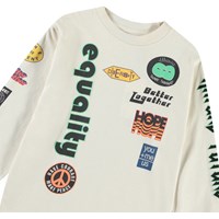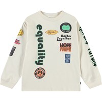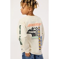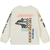Långärmad off-white topp i ekologisk bomull med ribbad kant på halsen och ärmarna. Toppen har en lös passform med små positiva motocrossreferenser.