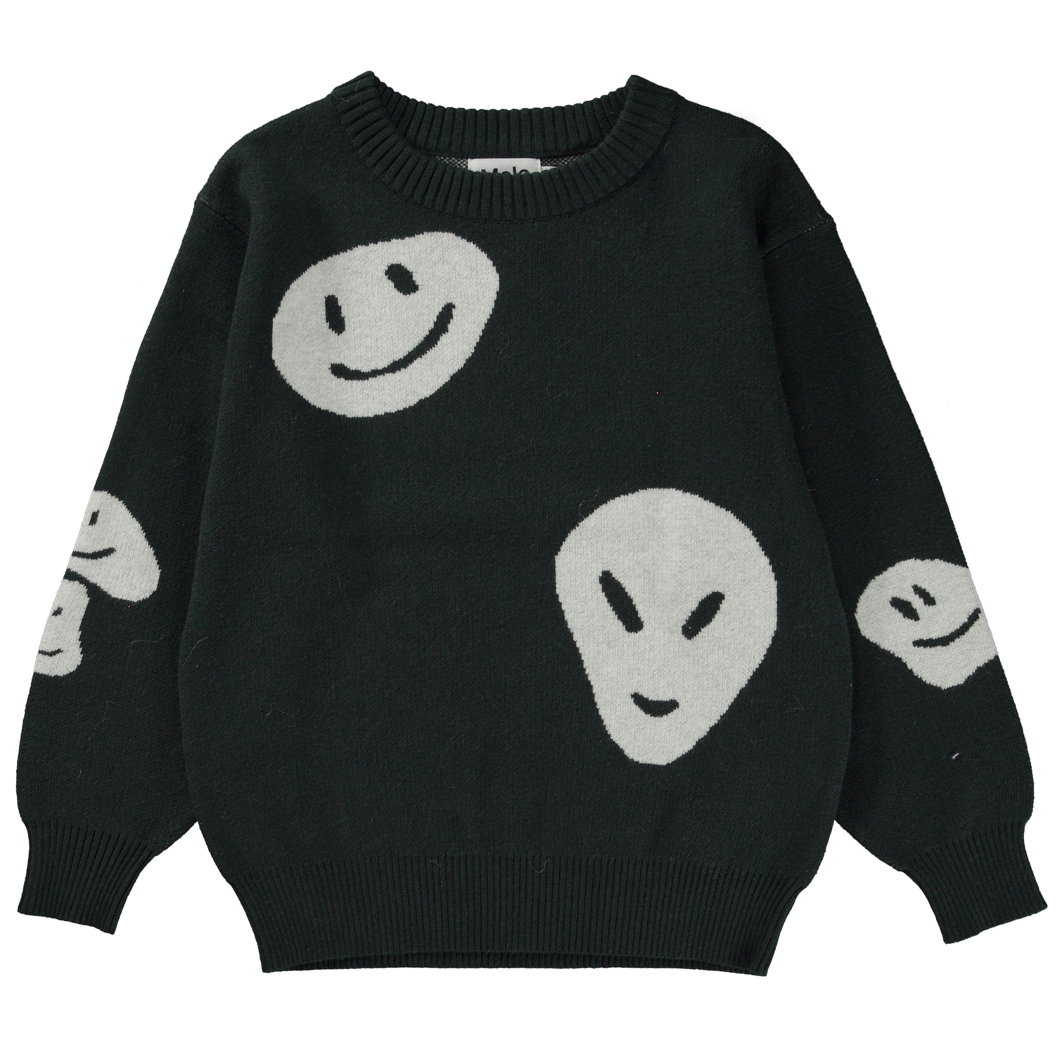 Svart stickad tröja med vitt mönster. Mönstret består av stora smileys som glider samman för att skapa en ny form - kanske kan du hitta ett peacetecken eller en rymdvarelse? Denna stickade tröja är tillverkad i en bomull/ull blandning, har långa ärmar, rund hals med ribb, ribb vid ärmar och höfter och en lös passform.