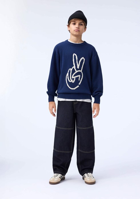 Mörkblå stickad tröja i en blandning av ull och bomull med rund hals och muddar samt nederkant i ribbad design. Den har en lös passform och ett stort handritat peacetecken.