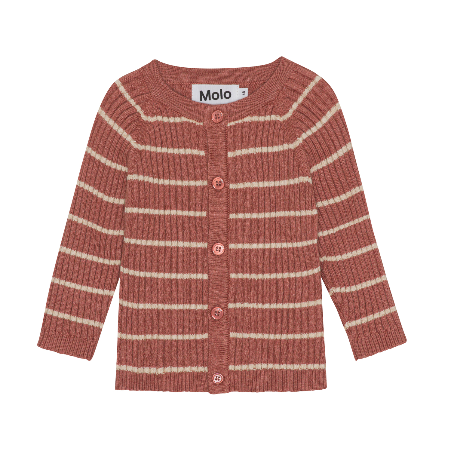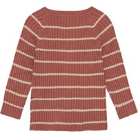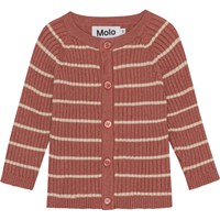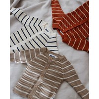 Mörkrosa stickad kofta med råvita ränder till de minsta. Denna kofta är tillverkad i en bomull/ull blandning, har rund hals i ribb, långa ärmar med raglansnitt, knappar framtill och ribb vid ärmar och höfter. Matcha ev. denna kofta med byxorna, Sigmund, i samma kvalitet för det perfekta setet.
