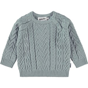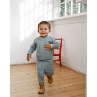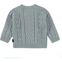 Svagt grön kabelstickad babytröja till de minsta. Denna tröja är tillverkad i en bomull/ull blandning, har ribb vid händer ch höfter, en rund hals med ribbkant och knappar vid halsen, så att tröjan är enkel att ta av och på. Matcha ev. denna trlja med byxorna, Sedge, i samma kvalitet för det perfekta setet.